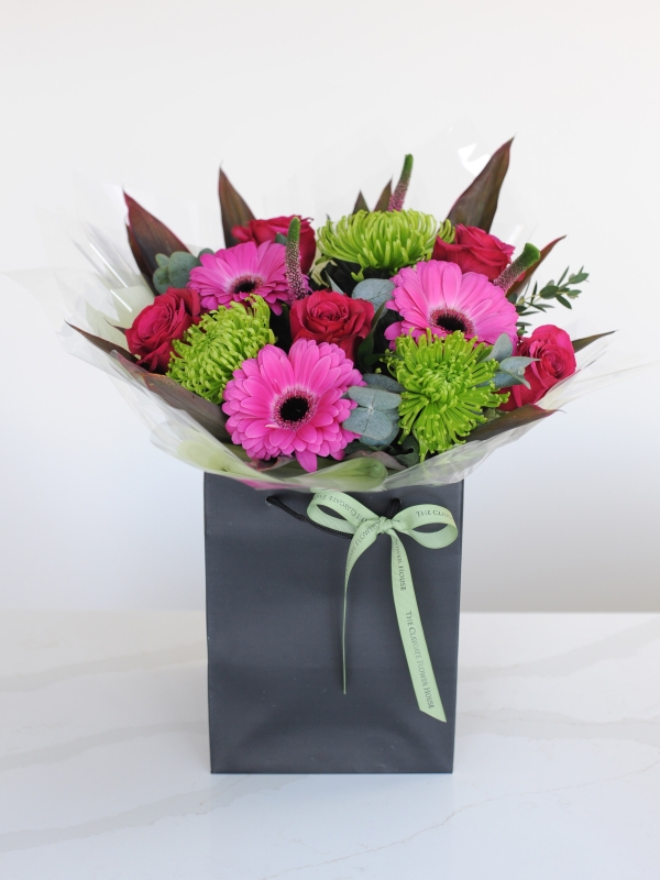 A hot Selection of fuchsia pink and lime green flowers in a modern hand-tied bouquet.