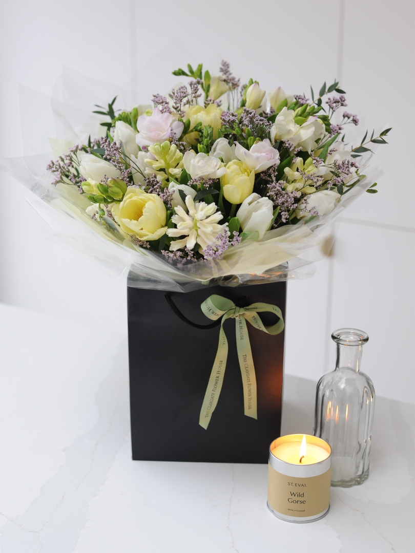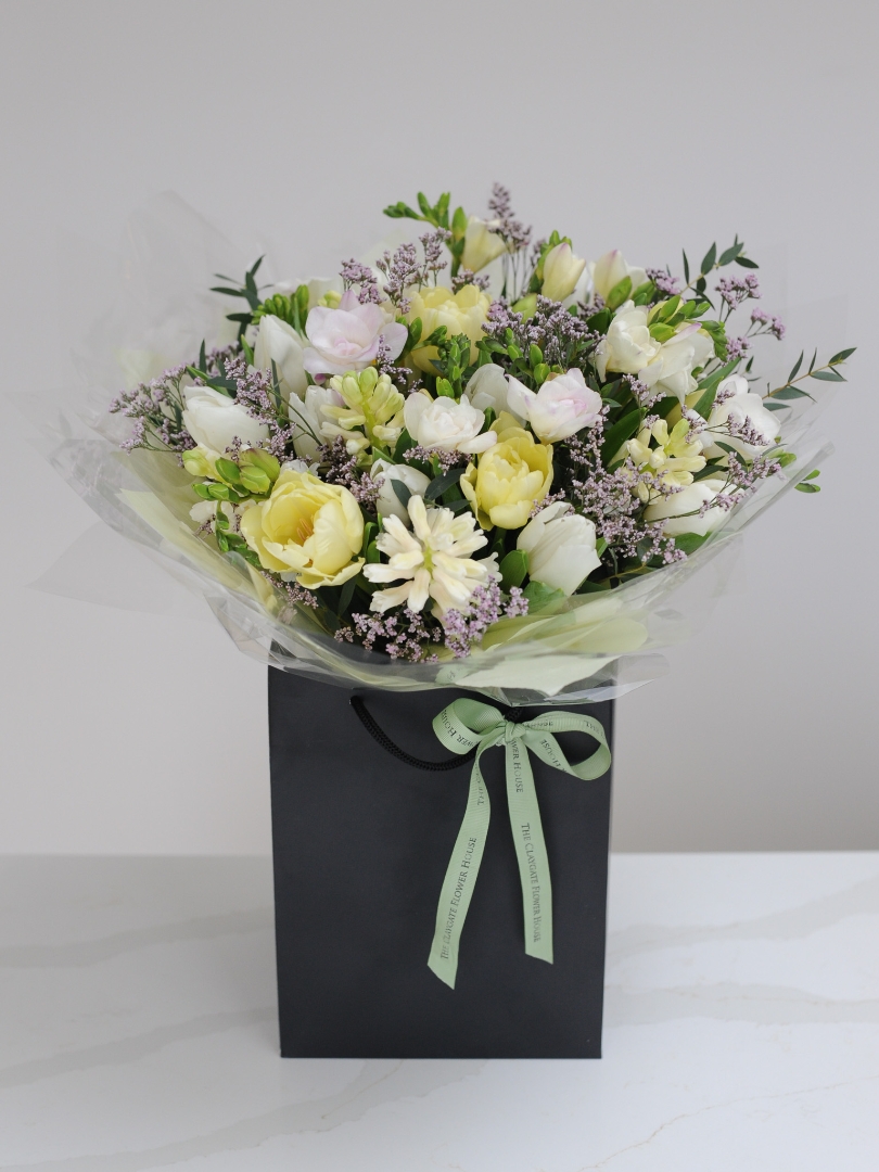 Your spring handtied bouquet will be a lush selection of "best on the day" mixed pastel spring flowers.