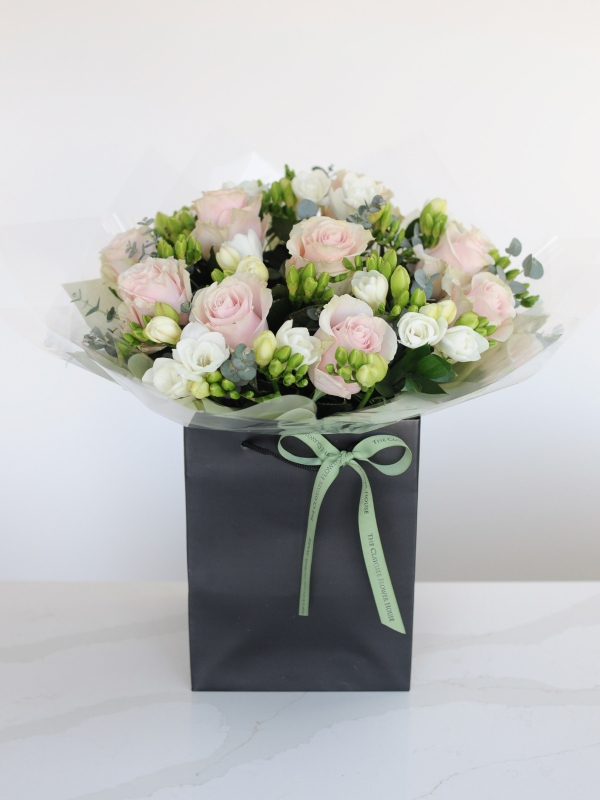A delicate handtied bouquet of beautiful large headed pink roses and fragrant white freesia. Classically bought together using fresh and seasonal foliages.